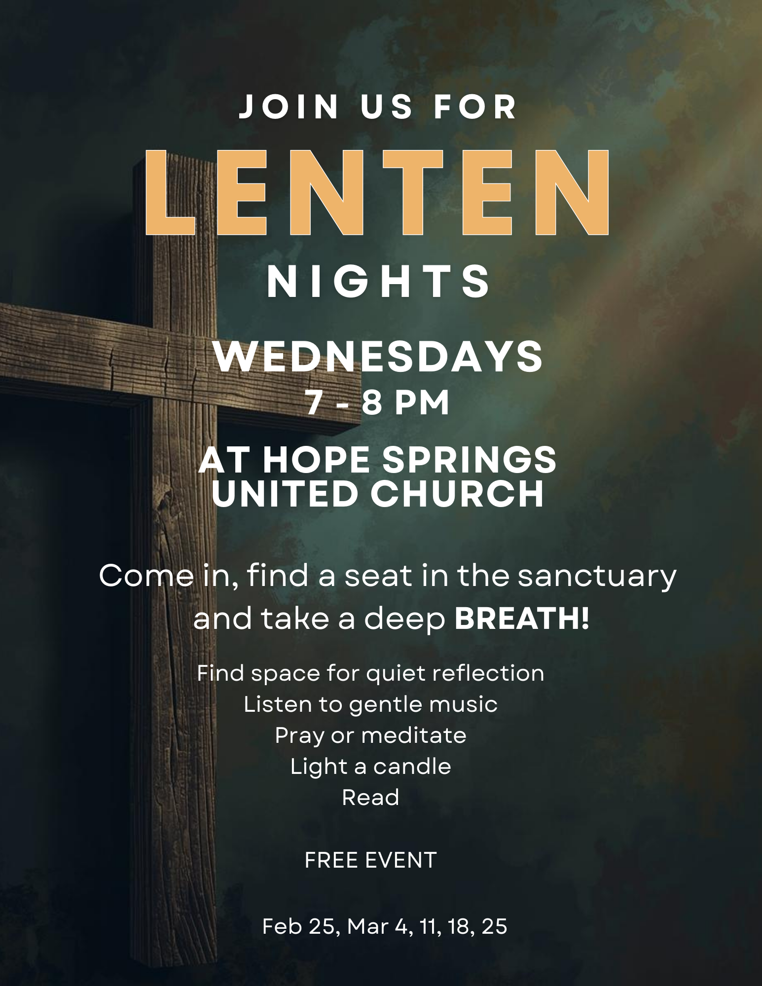 Hope Springs United Church invites you to experience Lenten Nights — peaceful evenings of rest and reflection during the Lent season.